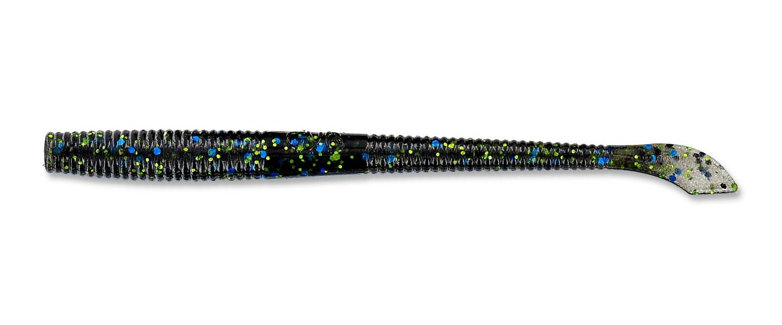 • Isca artificial preta com brilho azul e verde e extremidade cinza translúcida