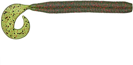 • Isca de pesca artificial flexível verde escuro com cauda enrolada verde claro e manchas vermelhas e pretas