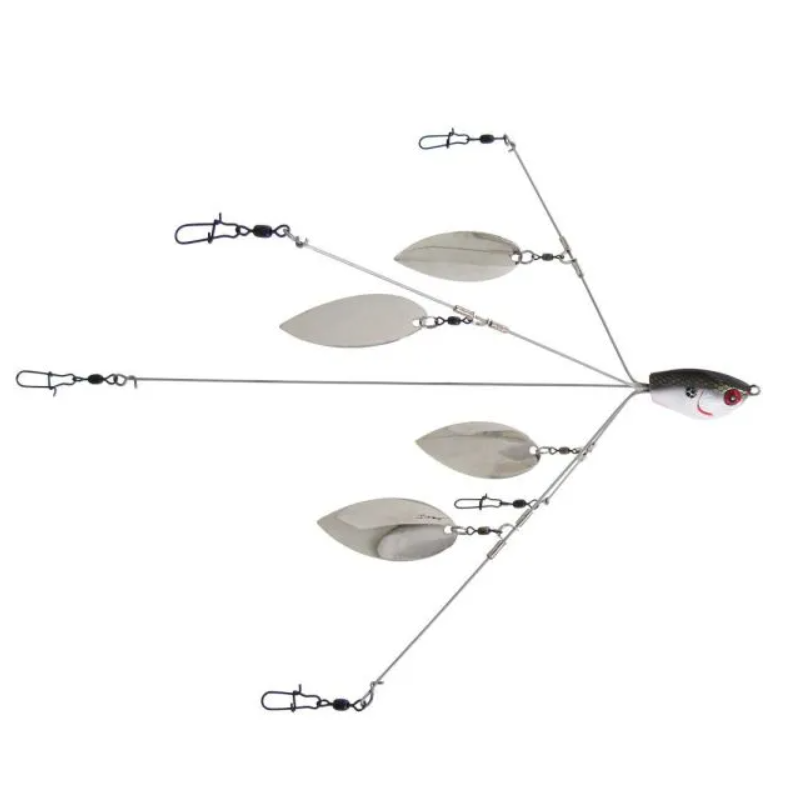 Mais flash equivale a mais peixes. O equipamento multi-isca YUMbrella Flash Mob de 5 fios tem todos os recursos que tornaram o YUMbrella o líder na categoria - aço inoxidável super resistente, arame tratado termicamente, encaixes e giros fortes e uma das conexões de fio mais resistentes do setor - e adiciona quatro lâminas no meio de cada braço externo para produzir brilho e vibração tremendos e criar a imagem de um cardume maior de peixes-isca.