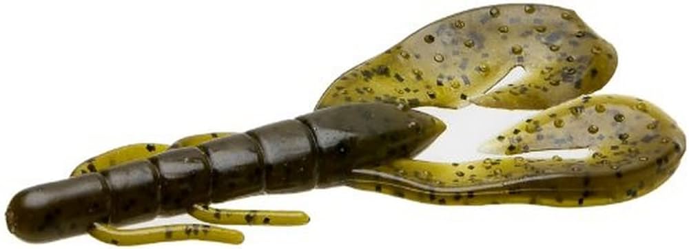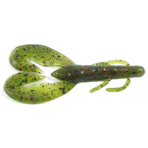 • Isca artificial em borracha verde translúcido com pontos pretos e vermelhos, formato de crustáceo