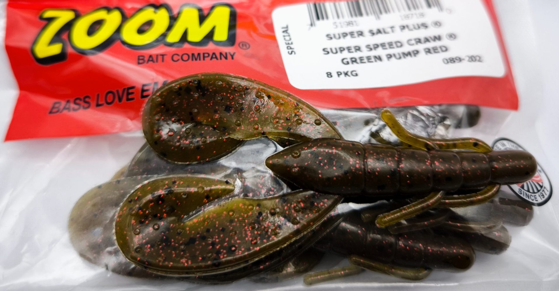 • Isca de pesca em forma de lagostim verde com brilhos vermelhos em embalagem plástica